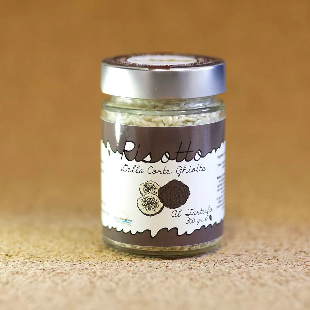 Ingredienti: Riso carnaroli, tartufo (Tuber Aestivum), aglio, erba cipollina, cipolla, aroma.